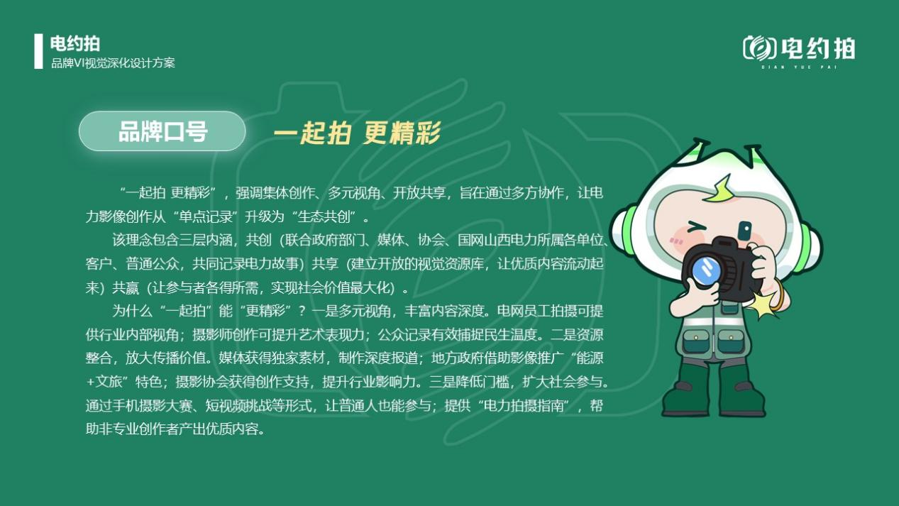 打造“電約拍”品牌,確定品牌定位、理念、愿景、口號、Logo、任務(wù),完成商標(biāo)注冊,編制品牌手冊,制作文創(chuàng)產(chǎn)品,通過聯(lián)合采風(fēng)、展覽推廣品牌。借助IP人物“晉電小新”影響力,增強(qiáng)作品內(nèi)容吸引力與互動(dòng)性,提升“電約拍”品牌知名度、認(rèn)可度。