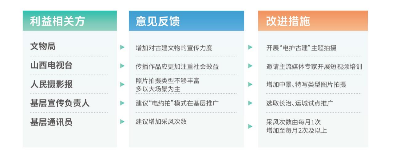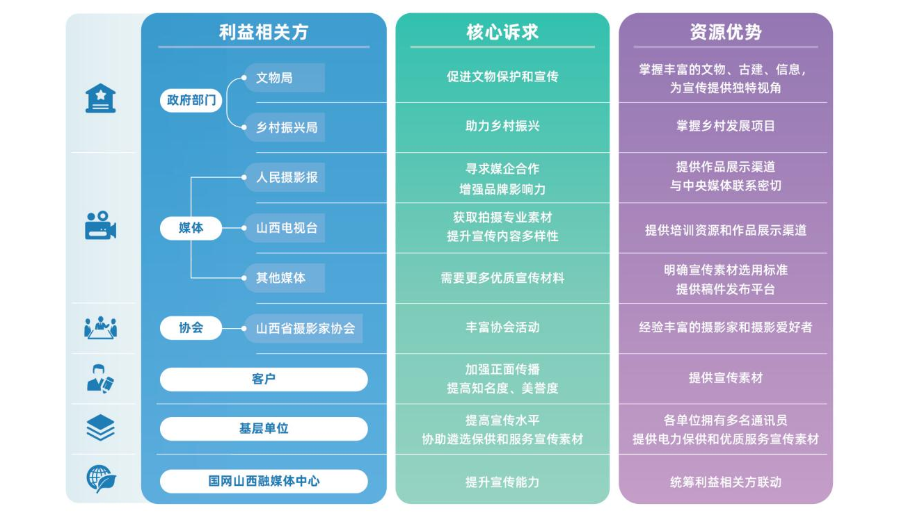 融媒體中心根植合作理念,將利益相關(guān)方拓展至政府部門(文物局、鄉(xiāng)村振興局等)、媒體(山西電視臺(tái)、人民攝影報(bào)等)、協(xié)會(huì)(山西省攝影家協(xié)會(huì)及市縣協(xié)會(huì)等)、基層單位、客戶(企業(yè)、人民群眾等),精準(zhǔn)識(shí)別分析各利益相關(guān)方的核心訴求與資源優(yōu)勢,搭建多方溝通平臺(tái),確保溝通協(xié)作順暢,推動(dòng)形成優(yōu)勢互補(bǔ)、資源共享的合作格局。