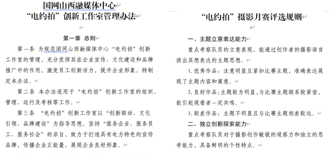 制定《“電約拍”創(chuàng)新工作室管理辦法》《2024年“師帶徒 青藍(lán)計(jì)劃”新聞采訪實(shí)訓(xùn)方案》《圖片資源管理系統(tǒng)管理辦法》《“電約拍”團(tuán)隊(duì)積分獎(jiǎng)勵(lì)辦法》《爭創(chuàng)“七個(gè)最”宣傳成果工作方案》《“為美好生活充電 為美麗中國賦能”攝影月賽評選規(guī)則》《“電約拍”采風(fēng)承諾書》等相關(guān)制度,通過完善的管理機(jī)制和制度,推進(jìn)了項(xiàng)目規(guī)范化運(yùn)營、標(biāo)準(zhǔn)化管理。加強(qiáng)團(tuán)隊(duì)文化建設(shè),“電約拍——佳片有約”團(tuán)隊(duì)師徒8人,通過附加“葫蘆家族”情愫,打造出“記錄時(shí)代、匠心傳承”的團(tuán)隊(duì)文化。