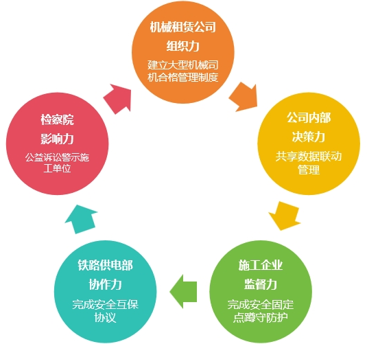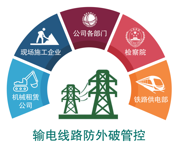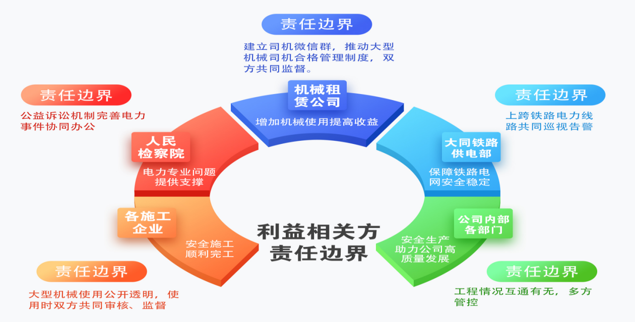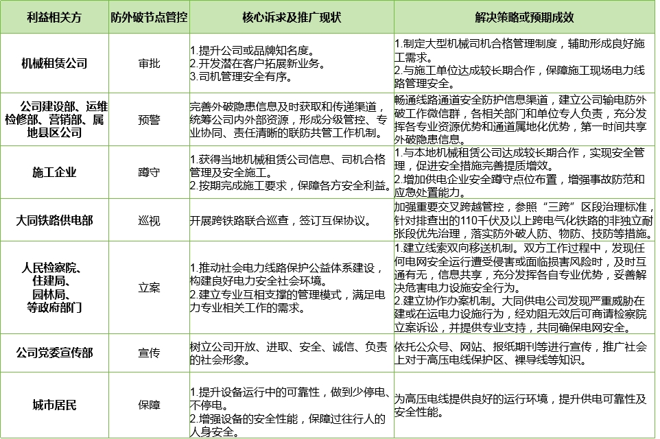 針對利益相關(guān)方的“五力”優(yōu)勢(組織力、決策力、監(jiān)督力、協(xié)作力、影響力),明確核心訴求和責(zé)任邊界,建立大型機(jī)械司機(jī)合格管理、臨時施工備案信息共享、施工固定點(diǎn)蹲守防護(hù)、鐵路安全互保協(xié)議、檢察院公益訴訟等多維度輸電線路防外破治理體系。