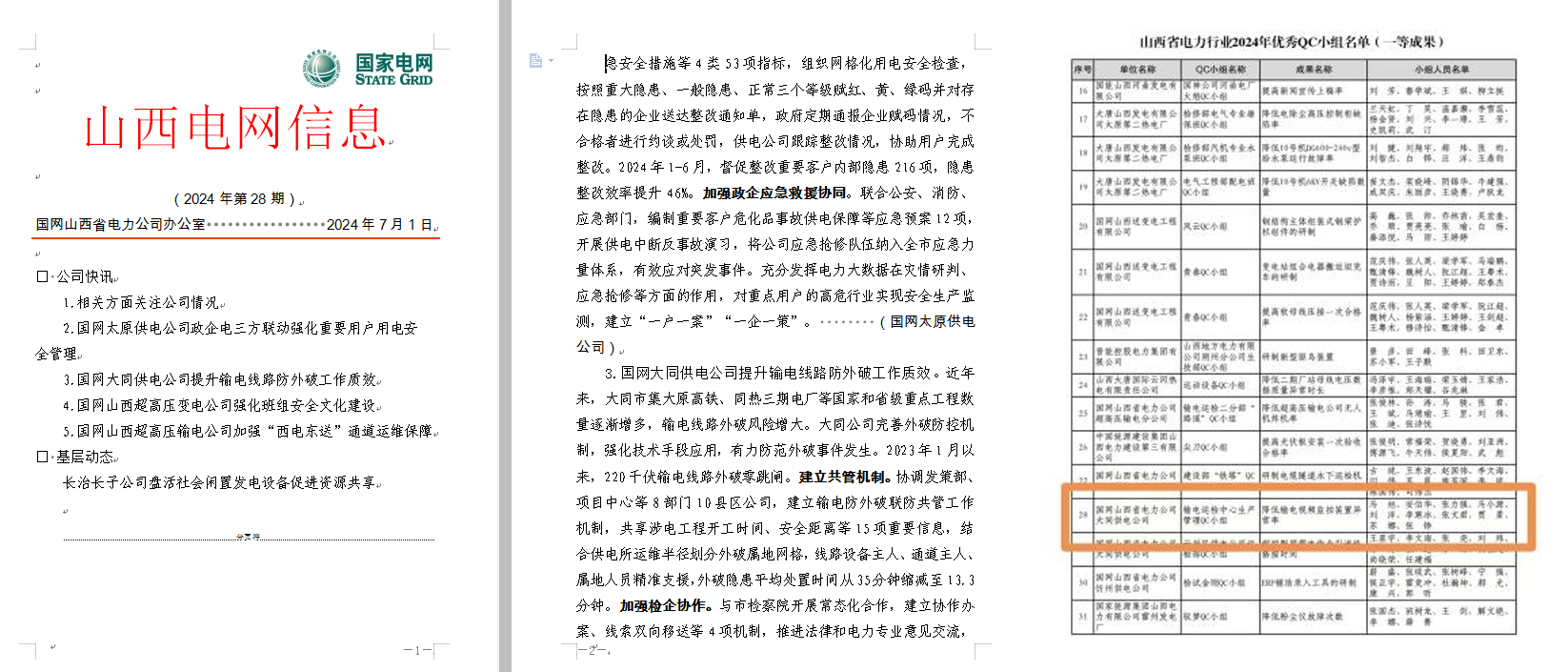 刊登《山西電網(wǎng)信息》2024年第28期,作為山西典型經(jīng)驗(yàn)做法全省宣傳推廣,先進(jìn)技術(shù)編寫課題獲得山西省電力行協(xié)QC成果一等獎。發(fā)布公司系統(tǒng)網(wǎng)基層動態(tài)多篇,內(nèi)網(wǎng)平臺點(diǎn)擊量合計破萬?!拔辶Α狈劳馄圃谏轿魇?1家地市公司開展試點(diǎn),均取得了正向反饋。